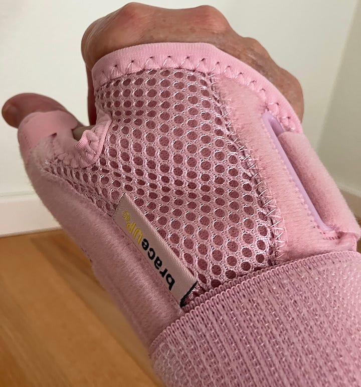 Arthritis and I have become far too chummy lately. It’s taken up residence in my left big toe, the one I broke as a kid, and at the base of my right thumb. (That may have something to do with writing, but I’m not ready to admit it.) I’ve started using Penetrex cream and a brace that stabilizes my thumb, and they are helping. Having less pain is a big hit with me. In the interest of full disclosure you should know that I don’t use the brace on my toe. It just doesn’t seem wise.