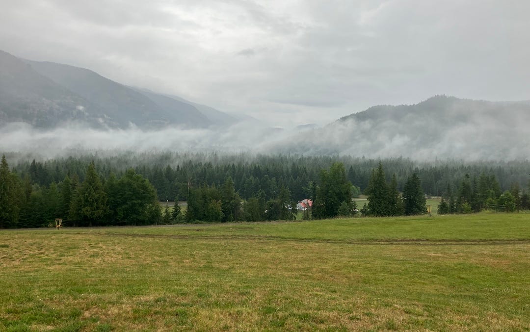 On the way from Iowa to Idaho and back, we drove through South Dakota, Montana, Wyoming, and Nebraska. Those states, along with Iowa, have been plagued by drought for several years. But the heavens opened in July, rain fell, and the countryside turned beautiful. Our eyes feasted on green fields and ditches filled with wildflowers for most of the trip. As you can see, the clouds came to visit the Idaho mountains where we stayed. It rained all day.
